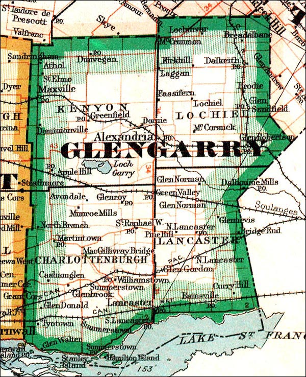 Glengarry includes four distinct areas in Eastern Ontario, Canada. They are Lochiel, Lancaster, Kenyon and Charlottenburgh. Glengarry is now divided into two areas, North Glengarry and South Glengarry.